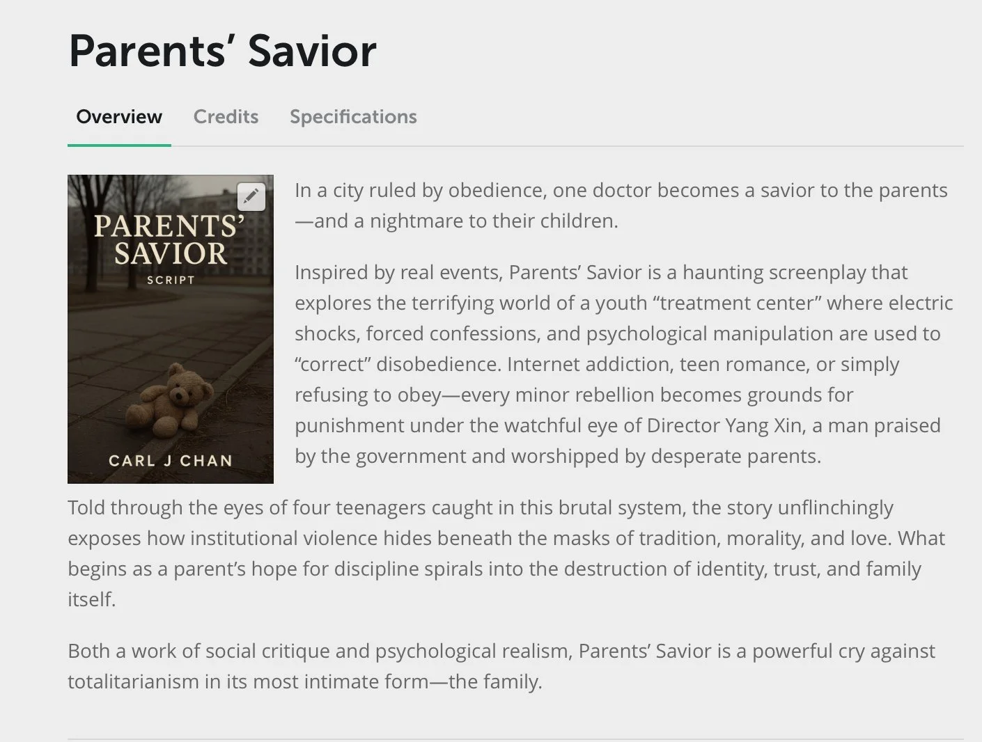 Inspired by real events, Parents’ Savior is a haunting screenplay that explores the terrifying world of a youth “treatment center” where electric shocks, forced confessions, and psychological manipulation are used to “correct” disobedience. Internet addiction, teen romance, or simply refusing to obey—every minor rebellion becomes grounds for punishment under the watchful eye of Director Yang Xin, a man praised by the government and worshipped by desperate parents.